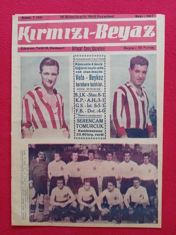Kırmızı-Beyaz Spor Mecmuası - 18 Ekim 1943 - Sayı: 287 - Kapak: İstanbul Şampiyonu Beşiktaş Kadrosu, Hakkı Yeten, Şeref Görkey (Ciltten çıkma)