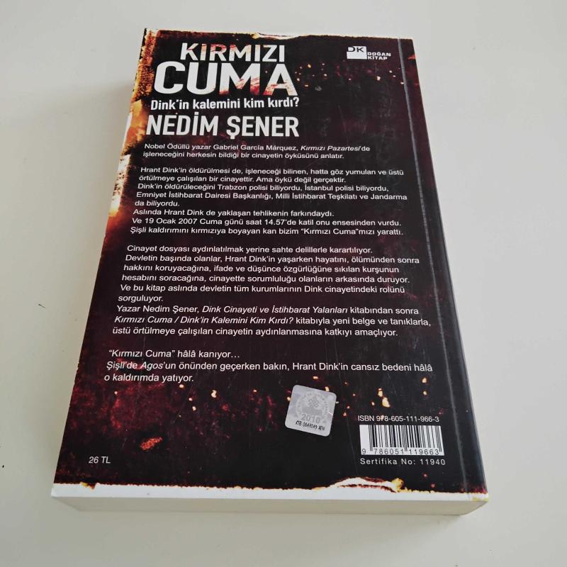 Kırmızı Cuma; Dink'in Kalemini Kim Kırdı?, Nedim Şener tarafından kaleme alınmıştır. Kitap 2011 yılında Doğan Kitap tarafından [İstanbul] yayınlanmıştır. Satışta olan kitap, yayınevinin 6. baskısıdır. 525 sayfadır. Kırmızı Cuma; Dink'in Kalemini Kim Kırdı? adlı eser Türkçe dilindedir.