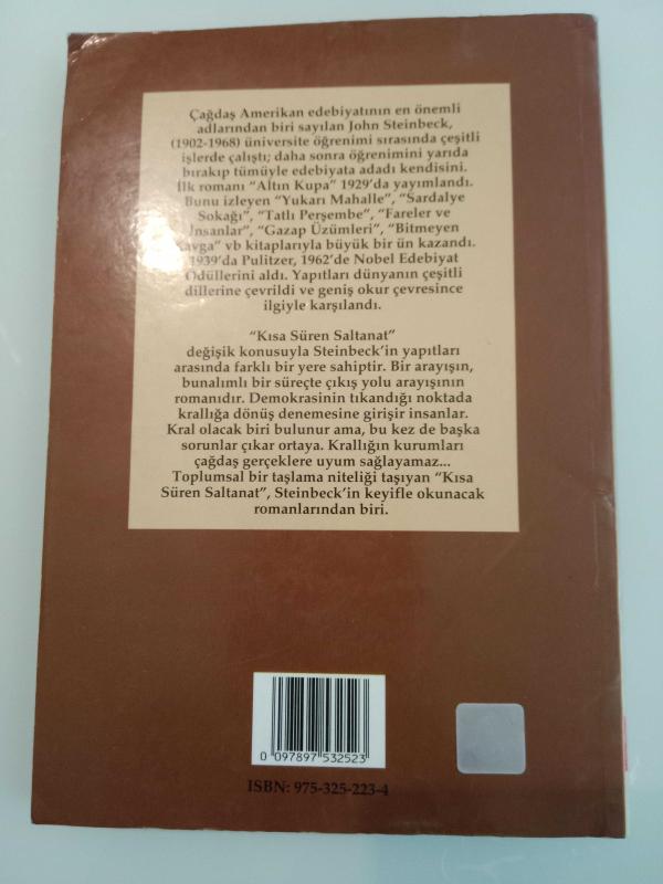 Kısa Süren Saltanat, John Steinbeck tarafından kaleme alınmıştır. Kitap 1996 yılında Ad Yayıncılık tarafından yayınlanmıştır. Satışta olan kitap, yayınevinin 1. baskısıdır. Bu baskının çevirisi Belkıs Çorakçı Dişbudak tarafından yapılmıştır. 158 sayfadır. Kısa Süren Saltanat adlı eser Türkçe dilindedir.