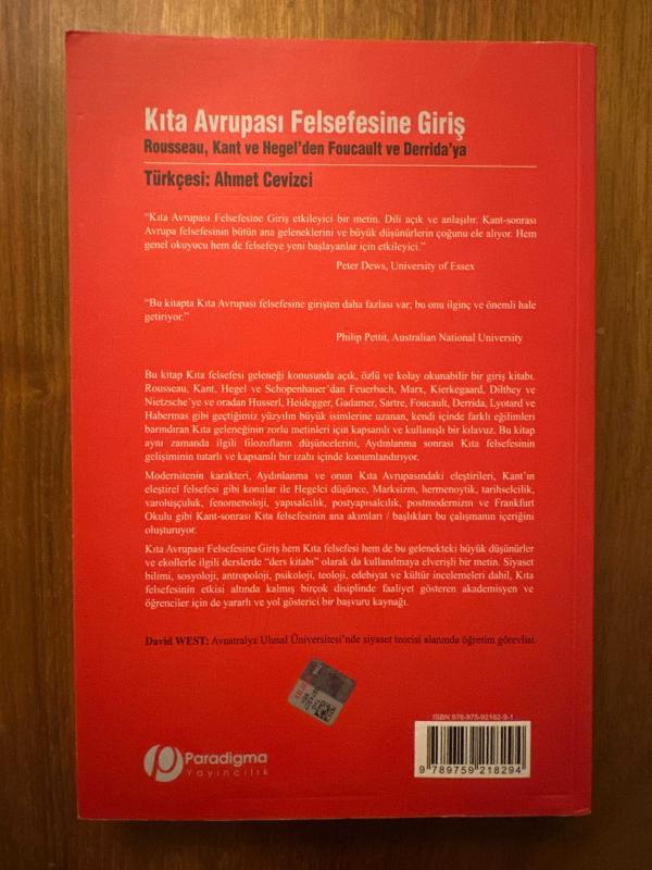 Kıta Avrupası Felsefesine Giriş: Rousseau, Kant ve Hegel'den Foucault ve Derrida'ya, David West tarafından kaleme alınmıştır. Kitap 2016 yılında Paradigma Yayıncılık tarafından [İstanbul] yayınlanmıştır. Bu baskının çevirisi Ahmet Cevizci - Hüsamettin Arslan tarafından yapılmıştır. Sayfa bilgisi XV+456 olarak belirtilmiştir. Kıta Avrupası Felsefesine Giriş: Rousseau, Kant ve Hegel'den Foucault ve Derrida'ya adlı eser Türkçe dilindedir.