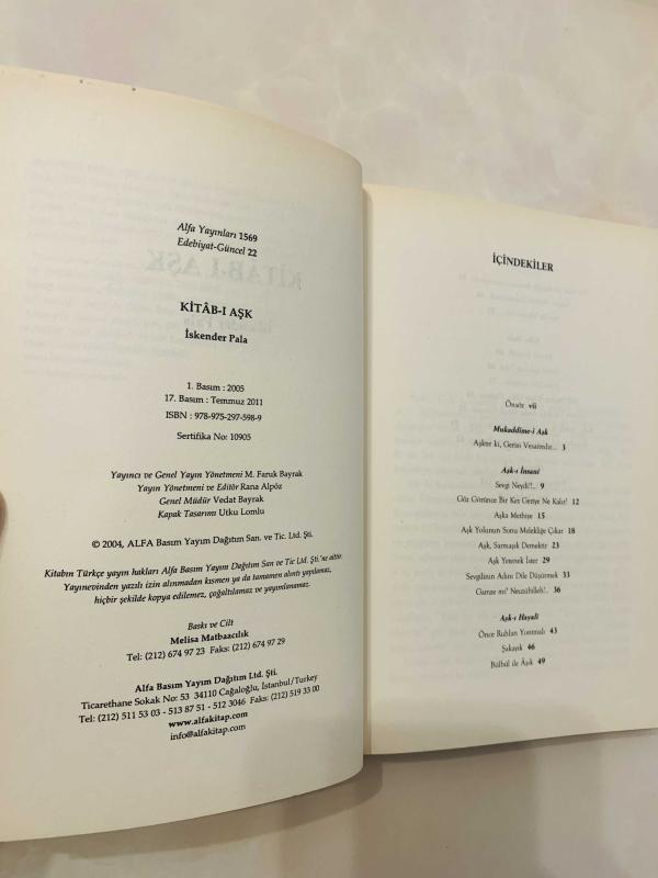 Kitab-ı Aşk, İskender Pala tarafından kaleme alınmıştır. Kitap 2011 yılında Alfa Yayınları tarafından yayınlanmıştır. 141 sayfadır. Kitab-ı Aşk adlı eser Türkçe dilindedir.