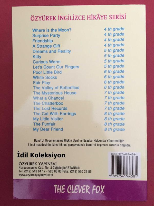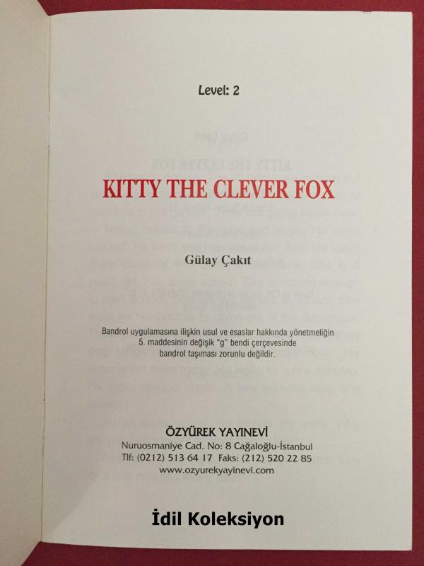 Kitty The Clever Fox - Gülay Çakıt - Özyürek Yayınevi (Zeki Tilki Kitty) İngilizce Hikaye Kitabı, Gülay Çakıt tarafından kaleme alınmıştır. Kitap 2013 yılında Özyürek Yayınevi tarafından [İstanbul] yayınlanmıştır. Bu baskının çevirisi - tarafından yapılmıştır. 16 sayfadır. Sayfa bilgisi - olarak belirtilmiştir. Kitty The Clever Fox - Gülay Çakıt - Özyürek Yayınevi (Zeki Tilki Kitty) İngilizce Hikaye Kitabı adlı eser İngilizce dilindedir.