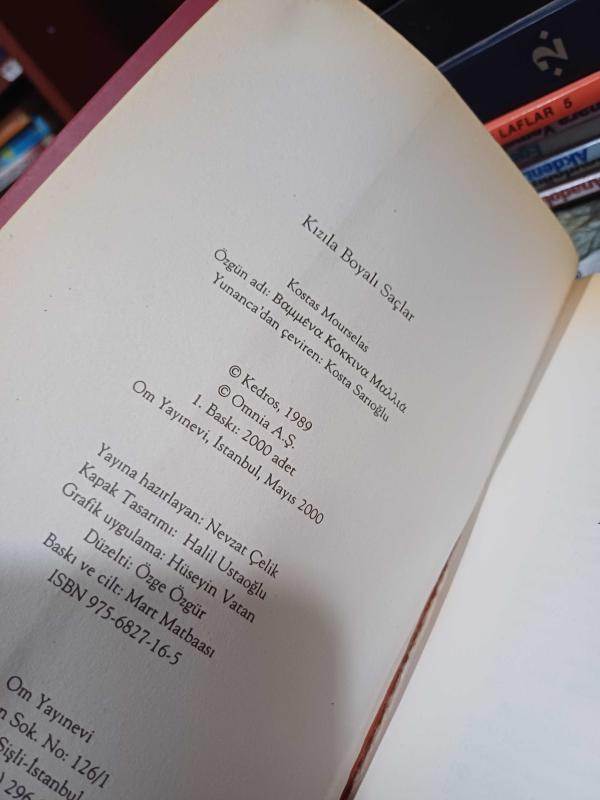 Kızıla Boyalı Saçlar, Kostas Mourselas tarafından kaleme alınmıştır. Kitap 2000 yılında Om Yayınevi tarafından [İstanbul] yayınlanmıştır. Bu baskının çevirisi Kosta Sarıoğlu tarafından yapılmıştır. 476 sayfadır. Kızıla Boyalı Saçlar adlı eser Türkçe dilindedir.
