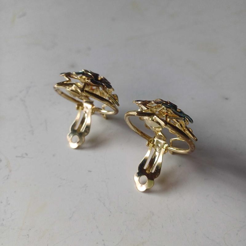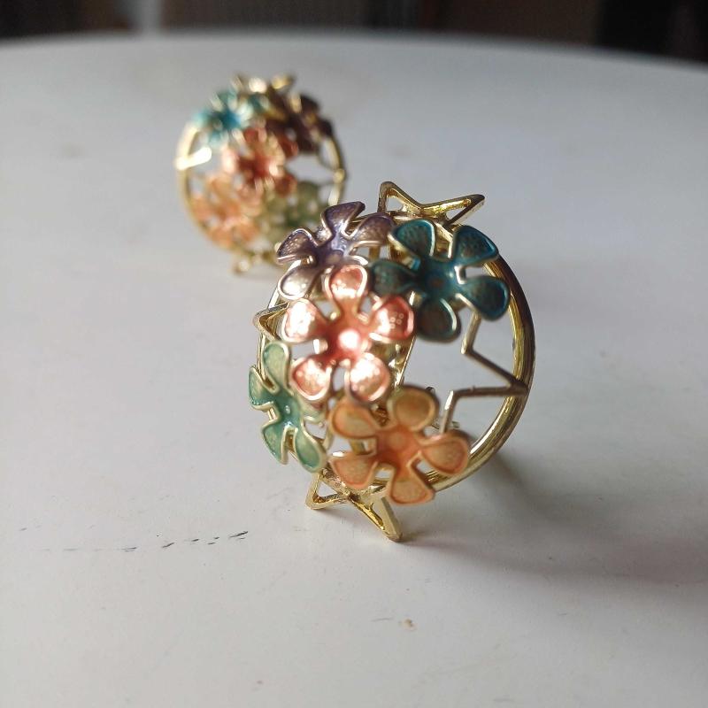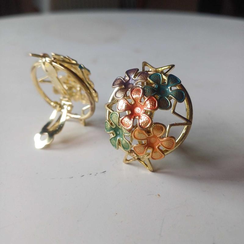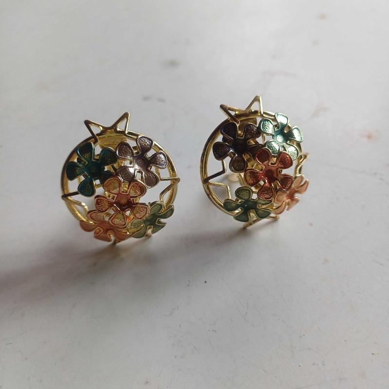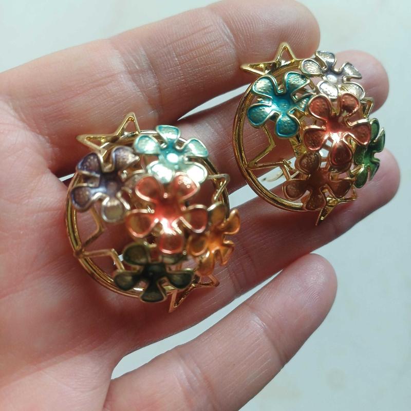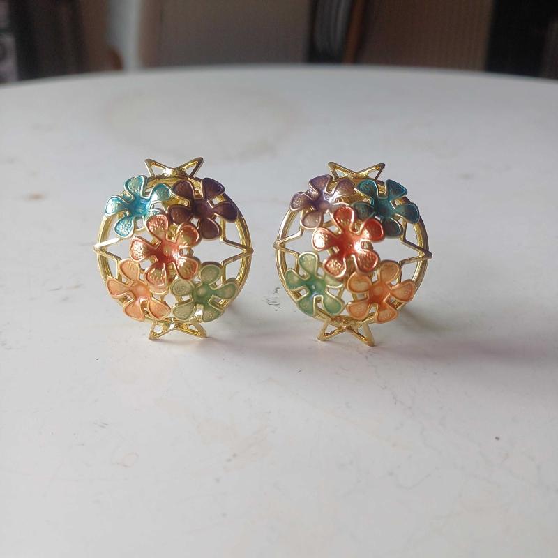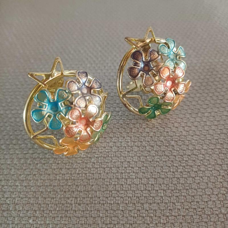 Gold rengi çicekli klipsli küpe. Yildiz figurleri uzerinde,somon ,turkuaz rengi cicekler. Çil kondisyon. Çap 3.cm