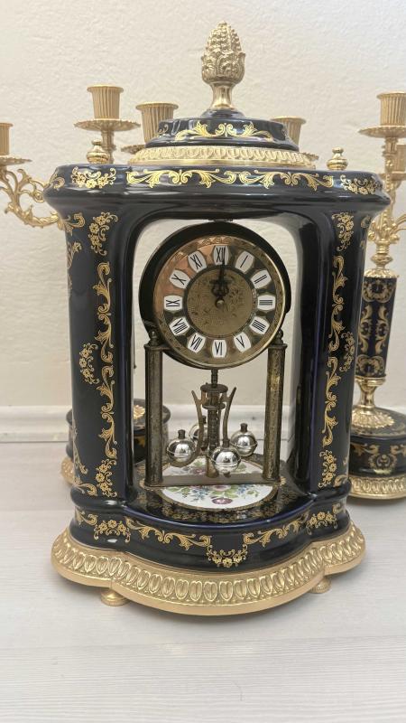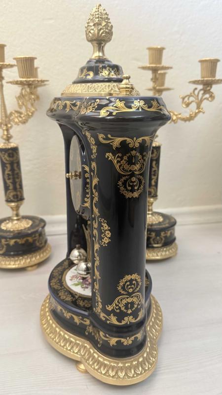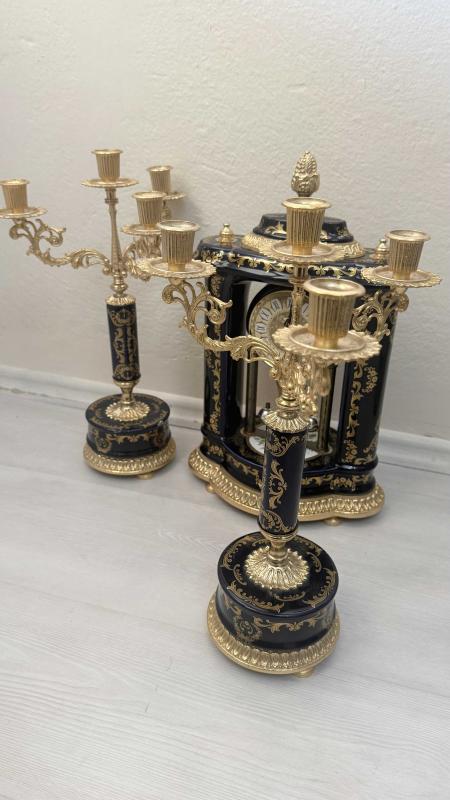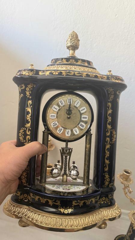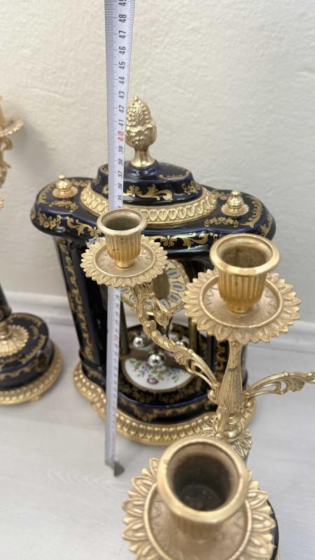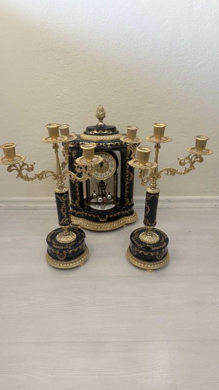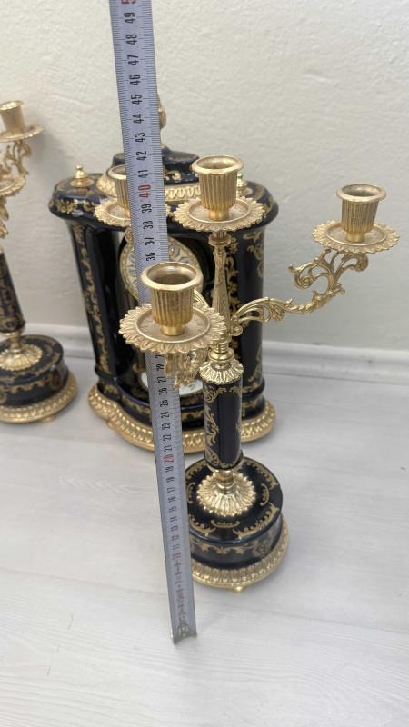Zarif tasarımlı, altın ve lacivert detaylara sahip masa saati ve ikili şamdan seti. 4 der kolu pirinç porselen altın yaldızlı şömine takımı Dekoratif ve şık bir görünüm sunar.
