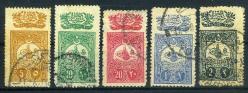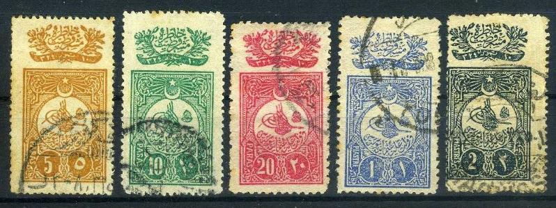 1908 yılında ilan edilen Meşrutiyetin anısına 5 pulluk hatıra serisi çıkarılmıştır. Damgalı olan pullar tam seridir.