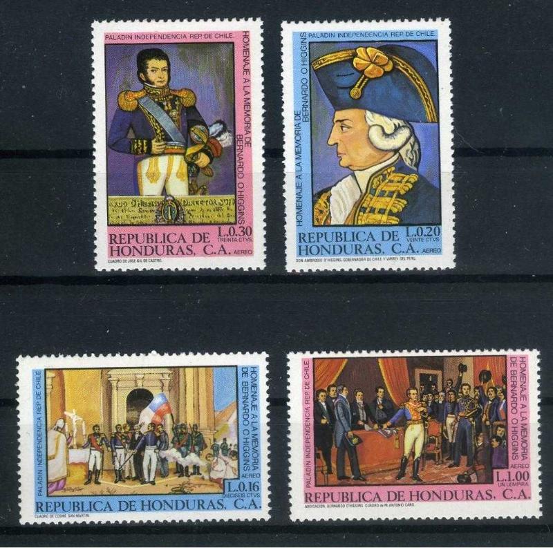 1770 Yılında Doğup 1820 yılında öle De Bernardo O'Higgins Şilinin İspanya işgalinde kurtarıp Şili Devletini Kuran Kahramandır.1981 Yılında HONDURAS PTT'si tarafından çıkarılmış anı pullarıdır. 4 Pulluk Damgasız Tam Seridir.