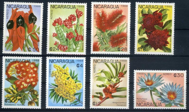 1988 Yılında Nicaragua PTT İdaresi 8 Pulluk Damgasız Tam Seri Çiçekler Konulu Anı Serisini kullanıma çıkarmıştır.
