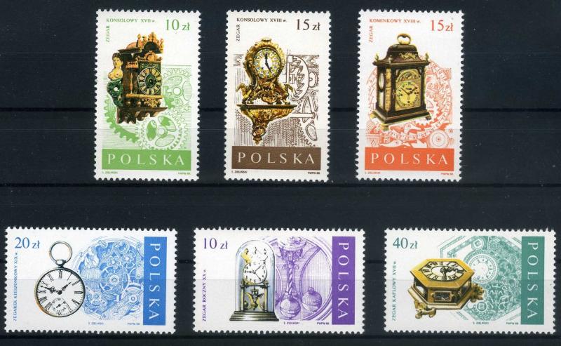 1988 Yılında Polonya Posta İdaresi 6 Pulluk Damgasız Tam Seri,Klasik Saatler Konulu Anı Pullarını Kullanıma çıkarmıştır.