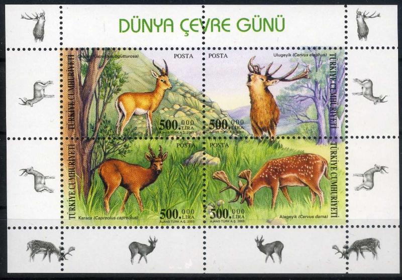 Ekolojik Dengenin İnsan Eliyle Bozulması,Yaban Hayatındaki "Nesil Tükenmesi" Bitki Örtüsündeki Yok Edilişler'e Karşı Tüm Ülkeler "Dünya Çevre Gününe" Dikkat çekecek eylemler başlattı,PTT İdareleri de bu konularda Pullar çıkarmaya başladı.PTT İdareside 2003 yılında Geyikler Konulu "Dünya Çevre Günü" Özel Blokunu kullanıma çıkarmıştır.