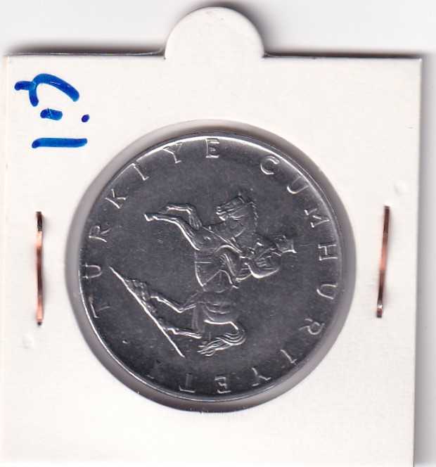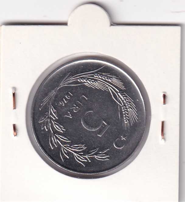 1976 yılı 5 Türk Lirası madeni 1976 yılı 5 Türk Lirası madeni parasıdır. Özellikleri: Akmonitall (paslanmaz çelik) malzemeden üretilmiştir. Tasarım: Ön yüzünde at üzerinde Atatürk figürü ve "TÜRKİYE CUMHURİYETİ" yazısı bulunmaktadır. Nadirlik: Bazı 1976 basımlarında, yılın arkasından gelen bir nokta hatası bulunur; bu hatalı paralar koleksiyoncular tarafından daha az bulunur olarak değerlendirilir.