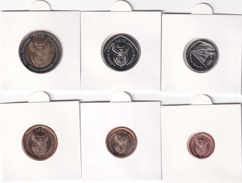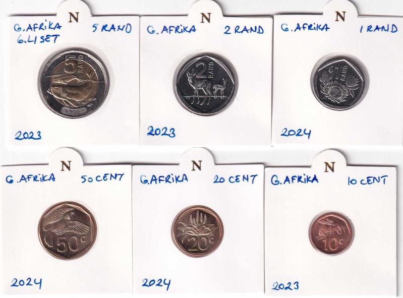 Güney Afrika Madeni Para Seti 6 adet Tam Takım 2023 ve 2024 yıllarına ait Güney Afrika Cumhuriyeti'ne ait 6 parçalık bir bozuk para koleksiyon seti bulunmaktadır. Set içerisinde 5 Rand, 2 Rand, 1 Rand, 50 Cent, 20 Cent ve 10 Cent'lik madeni paralar yer almaktadır. Paralar, koruyucu karton muhafazalar içerisinde sergilenmektedir. Madeni paraların üzerindeki tasarımlar, Güney Afrika'nın doğal yaşamını ve sembollerini temsil etmektedir