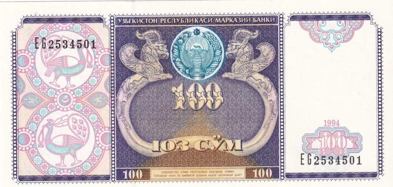 Koleksiyon Ürünü Özbekistan 100 Som 1994 çil Özbekistan Cumhuriyeti Merkez Bankası tarafından 1994 yılında çıkarılan 100 Som banknotu yer almaktadır. Ön Yüz: Özbekistan arması, iki tavus kuşu ve İskit torku (boyun halkası) tasviri bulunur. Arka Yüz: Taşkent'te bulunan Halklar Dostluğu Sarayı binasının resmi yer alır. Özellikler: Mor ve açık mavi renklerin ağırlıkta olduğu bu kağıt para, 142 × 69 mm boyutlarındadır. Durum: Bu banknot 1 Temmuz 2019 tarihi itibarıyla tedavülden kaldırılmıştır.