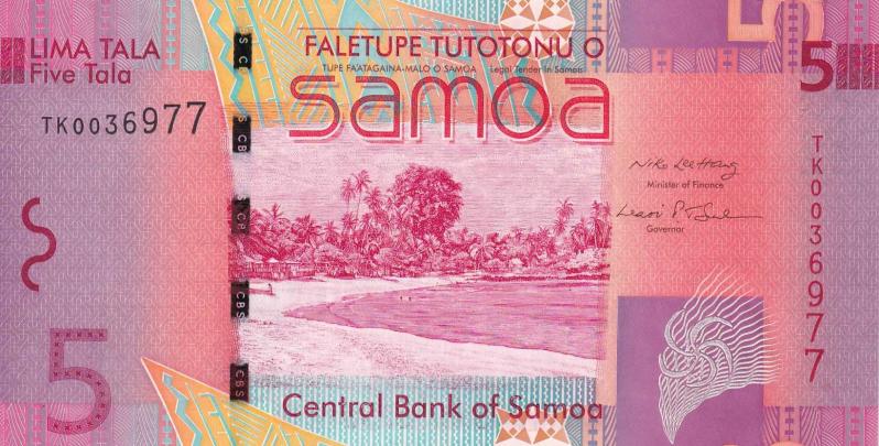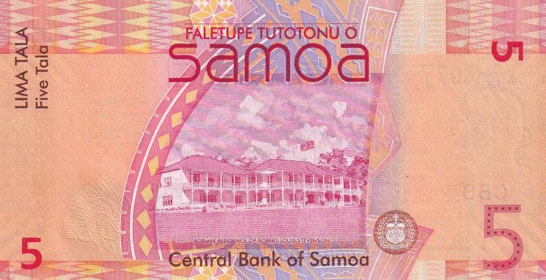 Samoa Merkez Bankası tarafından çıkarılan 5 Tala değerinde bir banknottur. Banknotun ön yüzünde "FALETUPE TUTOTONU O SAMOA" (Samoa Merkez Bankası) yazısı ve ülkenin adı yer alır. Arka yüzünde ise İskoç yazar Robert Louis Stevenson'ın eski ikametgahı olan "Villa Vailima" tasvir edilmiştir. Bu banknot, dayanıklılığı artırmak amacıyla kağıt yerine polimer plastik malzemeden üretilmiştir. Koleksiyon değeri taşıyan bu tür paralar, nadirlik durumuna göre değişken fiyatlarla alıcı bulabilmektedir. Çeviri Samoa Merkez Bankası Robert Louis Stevenson'ın Eski İkametgahı Beş Tala