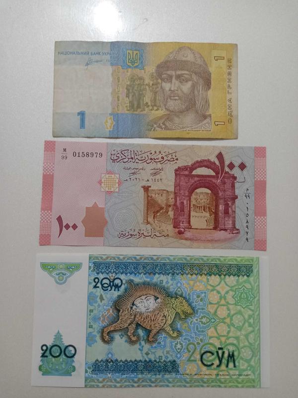 Hediyelik Çeşit Çeşit Ülkelerden Koleksiyonluk Metal-Kağıt Paralar Ukrayna 1 Grivna Temiz- Suriye 100 Pound Çil-Özbekistan 200 Som Çil Koleksiyonluk