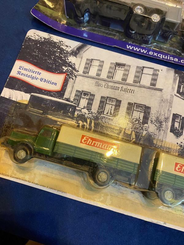 Altenmünster, Exquisa ve Ehrmann markalarına ait promosyon amaçlı üretilmiş 3 adet diecast tır modeli, orijinal blister ambalajlarında ve koleksiyonluk kondisyonda. Alman içecek ve gıda markalarına özel sınırlı üretim bu modeller, promosyon tır koleksiyonu yapanlar için tematik ve vitrinlik bir set. Koleksiyonunu genişletmek isteyenler için uygun fiyatlı