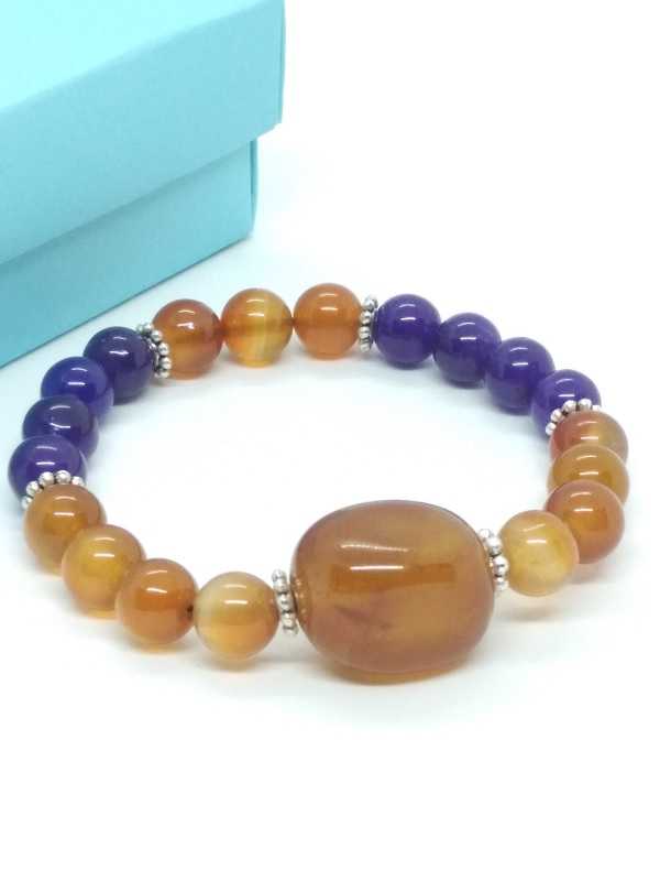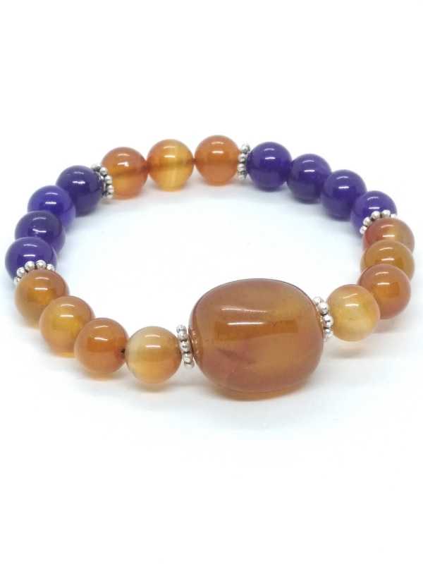 Ürün Detayları: Kullanılan Taşlar: 8 mm pürüzsüz kesim Turuncu Akik ve Mor Kuvars. Vurgu: Bilekliğin merkezinde, görsel bütünlüğü tamamlayan iri boy fıçı kesim doğal akik taşı bulunmaktadır. 2x1,4x1,4 cm ölçülerinde. Yapı: Yüksek dayanımlı esnek misina üzerine dizilmiştir, her bilek ölçüsüne uyum sağlar. Bileklik çevresi yaklaşık 19 cm ortalama ölçüdedir. Kondisyon: Sıfır, el yapımı ve kullanılmamış üründür. Neden Bu Bilekliği Seçmelisiniz? Akik taşının topraklayıcı enerjisi ile mor kuvarsın (ametist tonları) huzur veren etkisi bu tasarımda birleşti. Gümüş rengi ara aparatlar ile şık ve modern bir görünüm kazandırılmıştır. Hem günlük kullanım hem de özel bir hediye için idealdir. TEK ADET ÜRETİLMİŞTİR. Hızlı ve ücretsiz kargo ile özenle paketlenerek gönderilir. Hediyelik kutusu ile. Görseldeki kutu stoklara göre farklılık gösterebilir. KENDİNİZ VE SEVDİKLERİNİZ İÇİN ÖZEL BİR HEDİYE. Ürün resimdeki haliyle bire bir aynı gönderilir. Kendi tasarımımızdır.