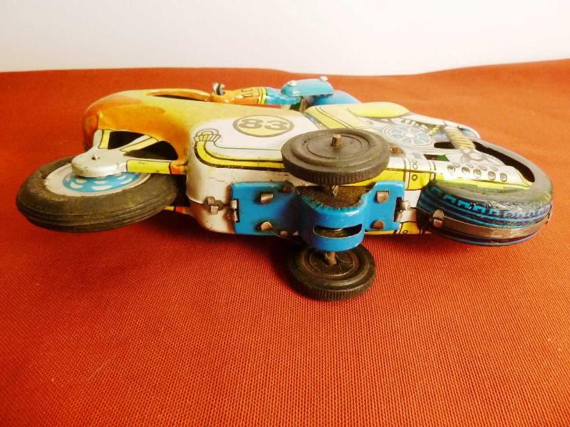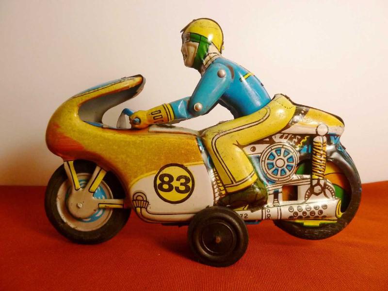 Kolları hareketli, ittir bırak yarışçı motosikleti teneke oyuncak . Boy 20 cm. Y 15 cm. başlıklı antika/koleksiyon objesinin menşei belirtilmemiştir. 1900-1949 arası dönemine aittir.