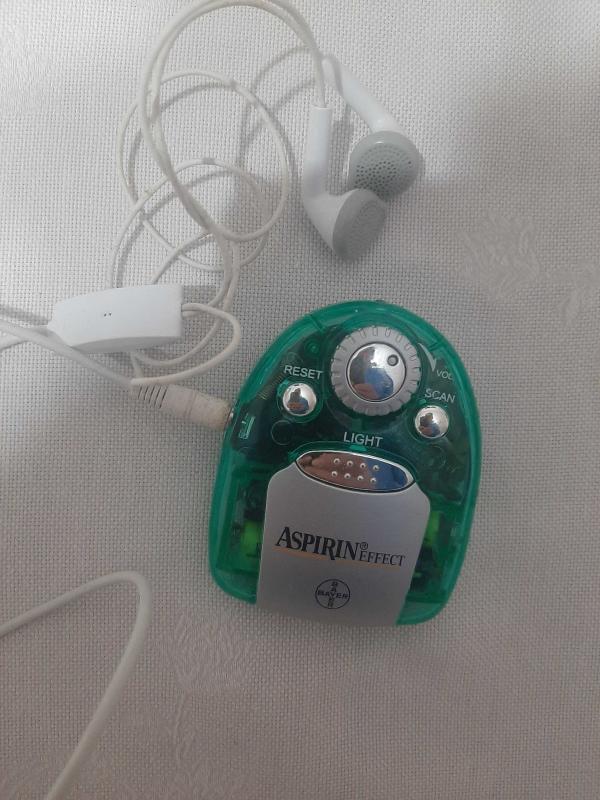 Bayer Firmasının Aspirin Effect ürünü için sınırlı sayıda üretilmiş 2000 li yılların başına ait şeffaf tasarım promosyon radyo. Dönemin ikonik şeffaf tasarım dilini yansıtan bu cihaz hem teknoloji objesi hemde bir tıp hatırasıdır. Scan -reset düğmeli otomatik FM arama ses ayar tekerleği ve dahili el feneri. Görsel olarak yazıları silinmemiş kasa diri durumda. Arka pil kapağı ancak çalışmasına engel değildir. Kulaklık girişi ile mükemmel çalışmaktadır.