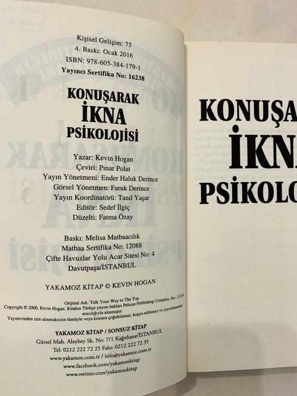 Konuşarak İkna Psikolojisi, Kevin Hogan tarafından kaleme alınmıştır. Kitap 2016 yılında Yakamoz tarafından yayınlanmıştır. 344 sayfadır. Konuşarak İkna Psikolojisi adlı eser Türkçe dilindedir.