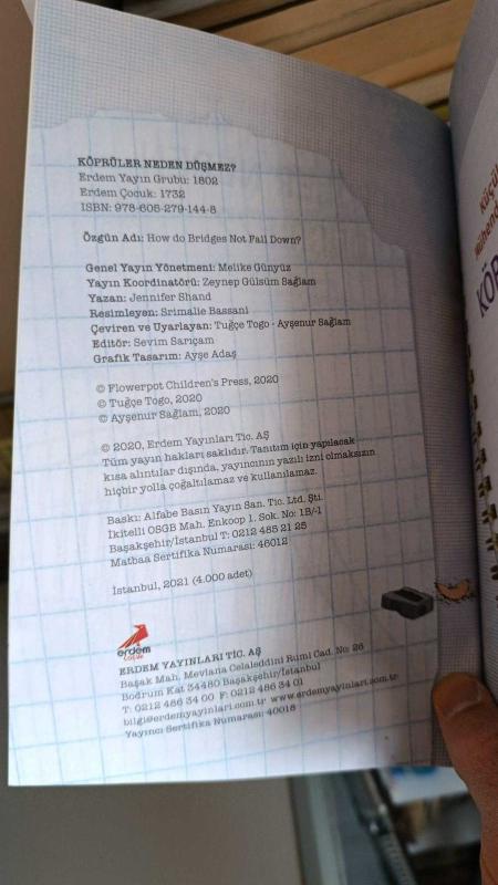 Köprüler Neden Düşmez? / Küçük Mimarlar ve Mühendisler İçin Rehber, Jennifer Shand tarafından kaleme alınmıştır. Kitap 2021 yılında ERDEM ÇOCUK YAYINLARI tarafından [İstanbul] 9786052791448 ISBN kodu ile yayınlanmıştır. Bu baskının çevirisi Tuğçe Toğo tarafından yapılmıştır. 48 sayfadır. Köprüler Neden Düşmez? / Küçük Mimarlar ve Mühendisler İçin Rehber adlı eser Türkçe dilindedir.