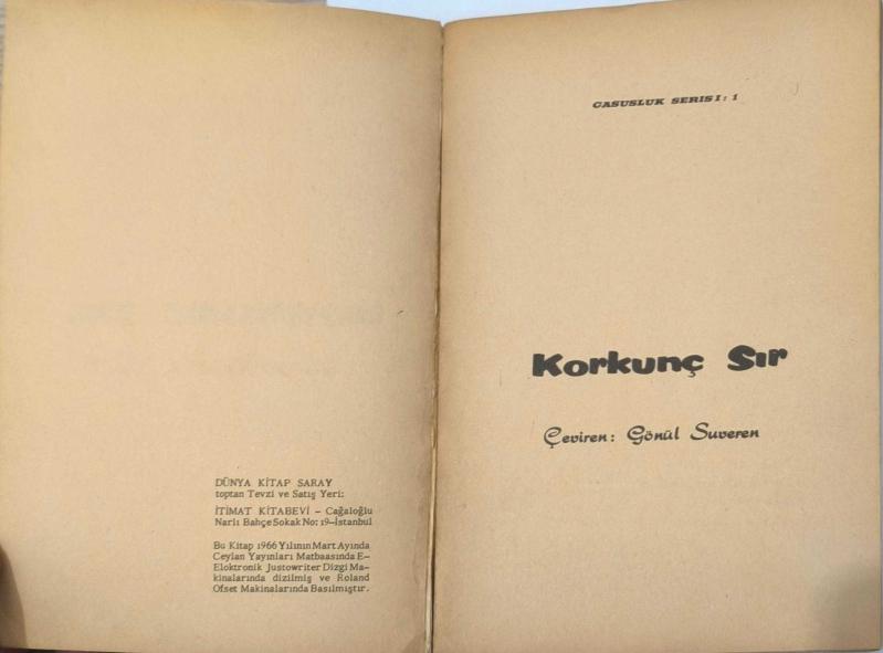 Korkunç Sır!, Alistair MacLean’in gerilim ve macera dozunu yüksek tutan, eski baskı polisiye romanlarından biridir.Elinizdeki nüsha 1966 baskı olup kapak tasarımı ve dönemin yayın karakteriyle nostaljik bir görünüm taşımaktadır. Eski baskı polisiye ve cep romanlarına ilgi duyan okurlar ile koleksiyonerler için dikkat çekici bir parçadır.Kondisyon: Kapakta belirgin kullanım izleri, kenarlarda aşınma, köşelerde yıpranma ve yaşa bağlı sararma mevcuttur. İç sayfalarda doğal ton değişimi görülmekte olup genel olarak okunabilir durumdadır; kondisyon olarak orta-alt / yorgun nüsha denebilir.