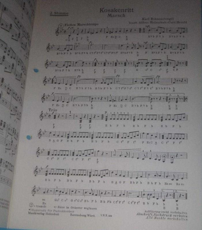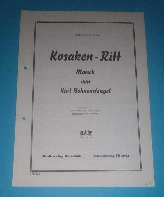 Kosakenritt / Marsch von Karl Bohnenstengel / Handharmonika (1. und 2. Stimme) - Akkordeon (1. und 2. Stimme ) / Nota, Karl Bohnenstengel tarafından kaleme alınmıştır. Kitap Musikverlag Holzschuh tarafından [Ravensburg] yayınlanmıştır. 4 sayfadır. Kosakenritt / Marsch von Karl Bohnenstengel / Handharmonika (1. und 2. Stimme) - Akkordeon (1. und 2. Stimme ) / Nota adlı eser Almanca dilindedir.