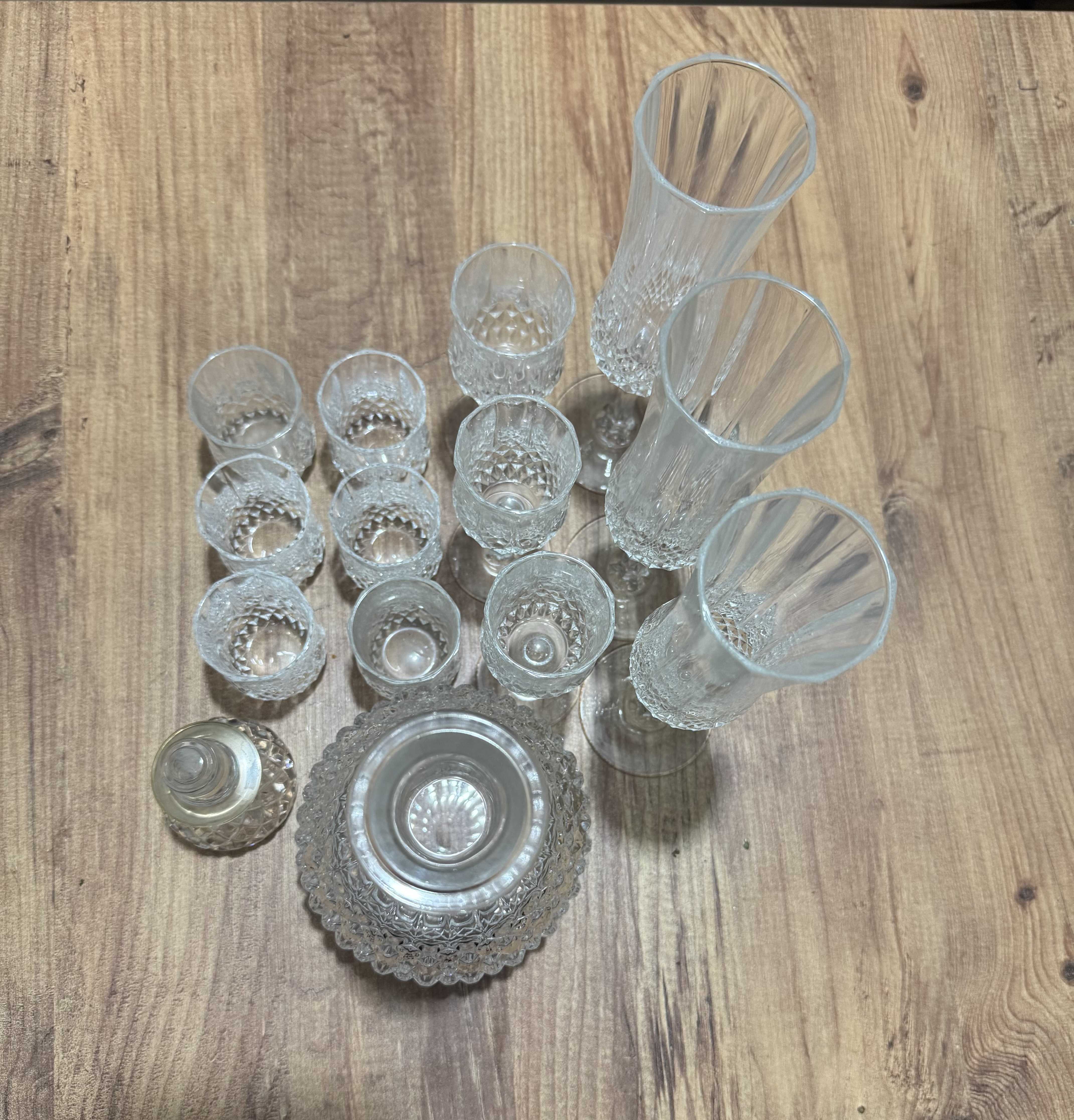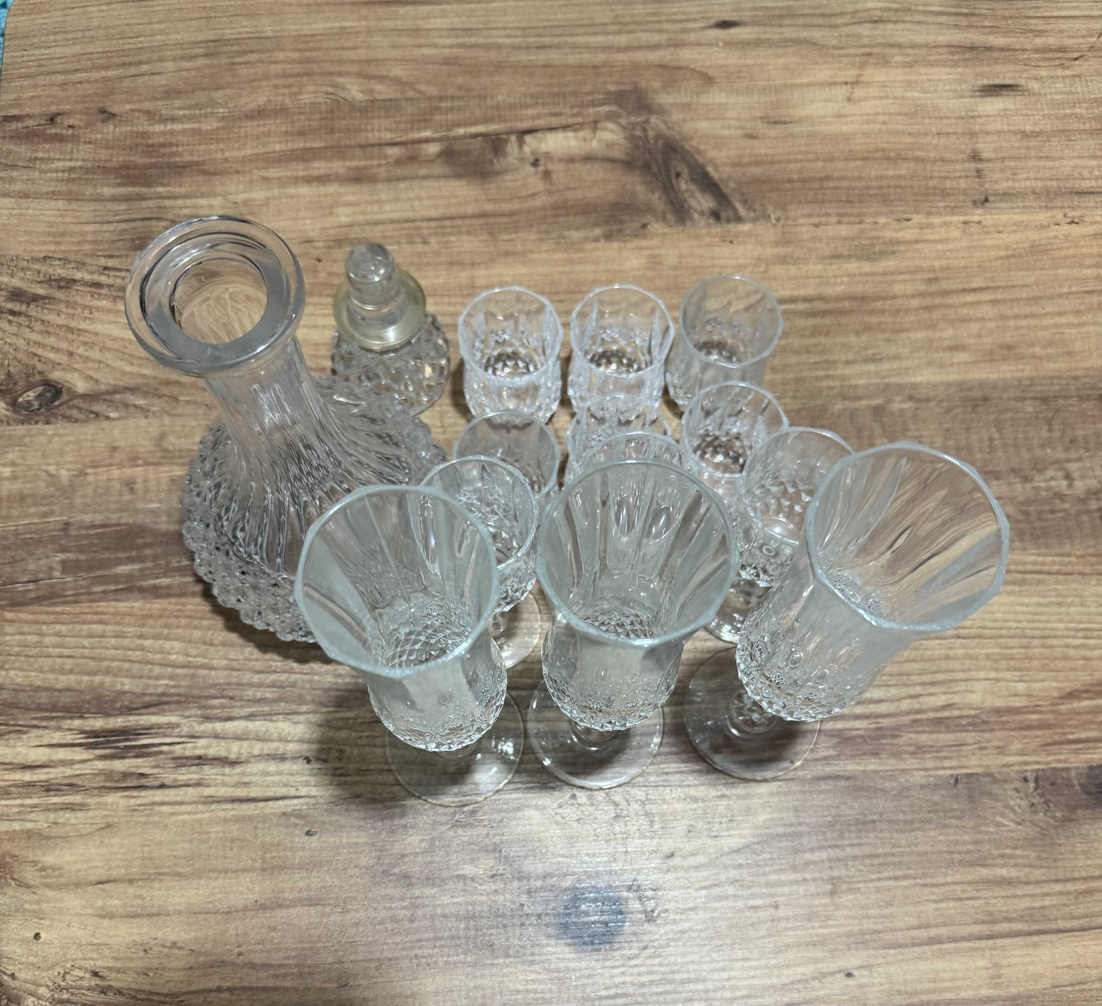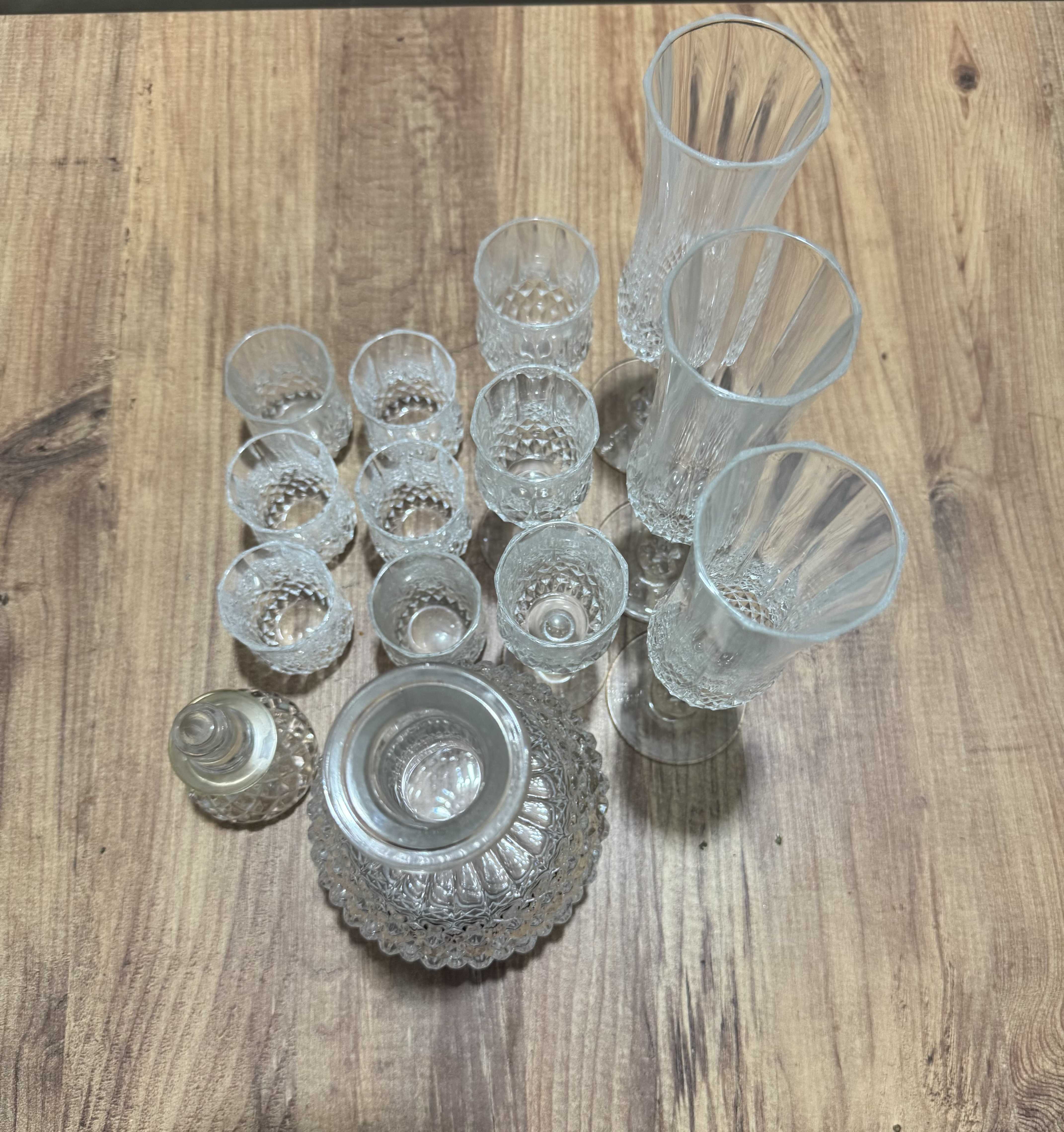 Kristal Kesme Likör ve İçki Takımı Şık sunumlar için eksiksiz, klasik ve zarif bir set. Hiçbir parçasında çatlak veya kırık bulunmamaktadır. Vitrin ürünü temizliğindedir. 1 Adet Büyük Boy Sürahi/Karaf (Tıpalı) 3 Adet Ayaklı Flüt Kadeh Kokteyl) 3 Adet Ayaklı Likör Kadehi 6 Adet Shot/Likör Bardağı 13 Parça