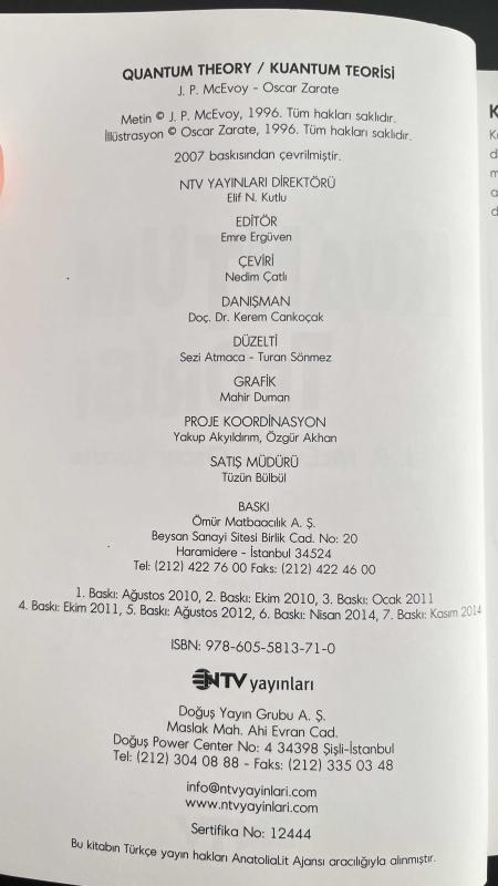 Kuantum Teorisi: Fiziğin En Gizemli Alanı İçin Çizgibilim - J.P. McEvoy, Oscar Zarate - NTV Yayınları, J.P. McEvoy, Oscar Zarate tarafından kaleme alınmıştır. Eser Emre Ergüven editörlüğünde hazırlanmıştır. Kitap 2014 yılında NTV Yayınları tarafından [İstanbul] 9786055813710 ISBN kodu ile yayınlanmıştır. Satışta olan kitap, yayınevinin 7. baskısıdır. Bu baskının çevirisi Nedim Çatlı tarafından yapılmıştır. 176 sayfadır. Sayfa bilgisi Kuşe Kağıt olarak belirtilmiştir. Kuantum Teorisi: Fiziğin En Gizemli Alanı İçin Çizgibilim - J.P. McEvoy, Oscar Zarate - NTV Yayınları adlı eser Türkçe dilindedir.