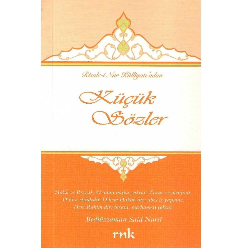 Küçük Sözler - Bediüzzaman Said Nursî (Cep Kitabı), Bediüzzaman Said Nursî tarafından kaleme alınmıştır. Kitap 2011 yılında Rnk Yayın tarafından [İstanbul] 9789759153137 ISBN kodu ile yayınlanmıştır. Satışta olan kitap, yayınevinin 1. baskısıdır. 93 sayfadır. Küçük Sözler - Bediüzzaman Said Nursî (Cep Kitabı) adlı eser Türkçe dilindedir.