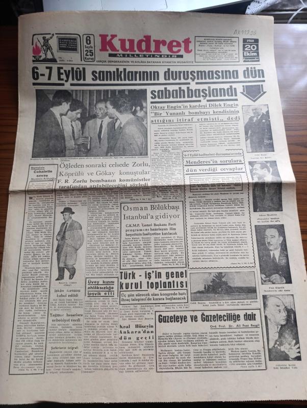 Kudret Gazetesi - Turkish Newspaper - 20 Ekim 1960 - cehaletle savaş yazan Nurettin Ardıçoğlu Başmakale - 6-7 Eylül sanıklarının duruşmasına dün sabah başlandı - Adnan Menderes'in avukatı Burhan Apaydın günün adamı oluverdi Fotoğrafı - Oktay Engin'in kardeşi Dilek Engin bir Yunanlı bombayı kendisinin attığını itiraf etmişti dedi - Celal Bayar Tazıdan 6-7 eylül'e Fotoğrafı - Adnan Menderes Yunanlılar bombayı biz koyduk der mi Fotoğrafı - Osman Bölükbaşı İstanbul'a gidiyor - öğleden sonraki celsede Fatin Rüştü Zorlu Fuat Köprülü ve Fahrettin Kerim Gökay konuştular - Fatin Rüştü Zorlu bombanın komünistler tarafından atılabileceğini söyledi - ünlü Fransız rejisörü Clouzot Brigitte Bardot'a intihar sahnesini ihtimam ile tekrarlatırken Fotoğrafı - Nijerya kongo'ya asker gönderiyor - CMKP irtica partisi mi yazan Kadircan Kaflı - 31 Mart vakası - 6 7 Eylül hadiseleri nasıl cereyan etmişti - Mareşal Fevzi Çakmak'a komünistlik damgası vurulmak istenmişti - Futbol Federasyonu toplantısı bitti, Fethi Giray tarafından kaleme alınmıştır. Kudret Gazetesi - Turkish Newspaper - 20 Ekim 1960 - cehaletle savaş yazan Nurettin Ardıçoğlu Başmakale - 6-7 Eylül sanıklarının duruşmasına dün sabah başlandı - Adnan Menderes'in avukatı Burhan Apaydın günün adamı oluverdi Fotoğrafı - Oktay Engin'in kardeşi Dilek Engin bir Yunanlı bombayı kendisinin attığını itiraf etmişti dedi - Celal Bayar Tazıdan 6-7 eylül'e Fotoğrafı - Adnan Menderes Yunanlılar bombayı biz koyduk der mi Fotoğrafı - Osman Bölükbaşı İstanbul'a gidiyor - öğleden sonraki celsede Fatin Rüştü Zorlu Fuat Köprülü ve Fahrettin Kerim Gökay konuştular - Fatin Rüştü Zorlu bombanın komünistler tarafından atılabileceğini söyledi - ünlü Fransız rejisörü Clouzot Brigitte Bardot'a intihar sahnesini ihtimam ile tekrarlatırken Fotoğrafı - Nijerya kongo'ya asker gönderiyor - CMKP irtica partisi mi yazan Kadircan Kaflı - 31 Mart vakası - 6 7 Eylül hadiseleri nasıl cereyan etmişti - Mareşal Fevzi Çakmak'a komünistlik damgası vurulmak istenmişti - Futbol Federasyonu toplantısı bitti adlı eser Türkçe dilindedir.