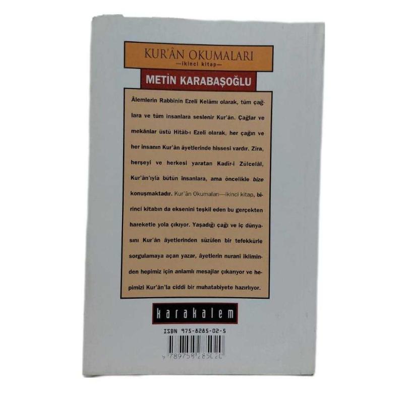 Kur'an Okumaları 2, Metin Karabaşoğlu tarafından kaleme alınmıştır. Kitap 2000 yılında KARAKALEM YAYINLARI tarafından [İstanbul] yayınlanmıştır. Satışta olan kitap, yayınevinin 1. baskısıdır. 228 sayfadır. Sayfa bilgisi 3.hamur olarak belirtilmiştir. Kur'an Okumaları 2 adlı eser Türkçe dilindedir.