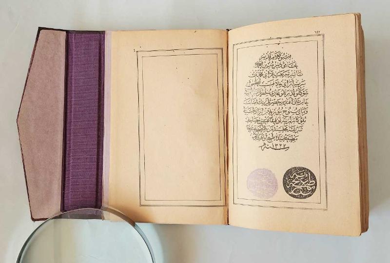 Son sayfada Osmanlı Türkçesi ile künye bilgileri ve Bahriye Matbaasının mührü ile yayıncı (nâşir) mührü var. Baş sayfada Osmanlıca el yazısı ile vakıf kaydı var. Hem sayfa numarası hem de buldurusu var. Mıklepli, nakışlı, orijinal komple deri cildinde. (Ehil mücellit eliyle aslına uygun bir şekilde restore edilmiş, ömrüne ömür katılmış, gayet temiz bir nüsha.) Tarih: 1322 [1904-1905]