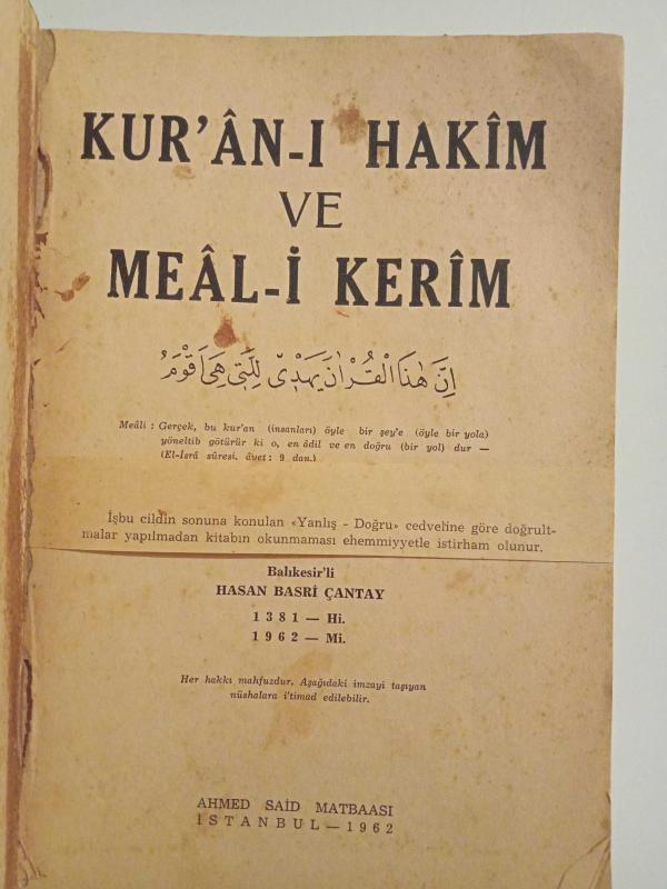 Kur'an'ı Hâkim ve Meali Kerim 1. Cilt, Hasan Basri Çantay tarafından kaleme alınmıştır. Kitap 1962 yılında Ahmed Said Matbaası tarafından yayınlanmıştır. Satışta olan kitap, yayınevinin 4. baskısıdır. 472 sayfadır. Kur'an'ı Hâkim ve Meali Kerim 1. Cilt adlı eser Türkçe dilindedir. Eserin içeriğinde Arapça dilinde bölümlere de yer verilmektedir.