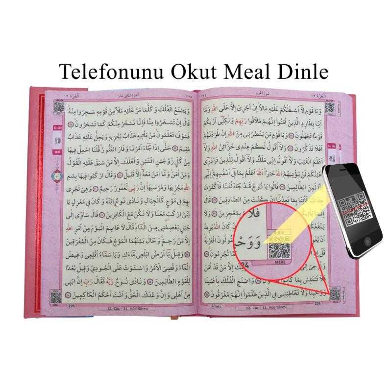 Kuranı Kerim Bilgisayar Hatlı Peme Mavi Renk Rahle Boy 1.Hamur Kağıt, Lüks Bez Cilt, 2 Şehrazeli, 4 Renk Baskı... Dünyada En Kolay Okunan Bilgisayar Hattı ile Hazırlandı... Okuyucularımızın Kur'an-ı Kerime Olan ilgisini ve sevgisini arttırmak için pembe ve mavi renklerde tasarlanmıştır.... Bu Kur'an-ı Kerim özel iç tasarım desenleri, göz yormayan renkleri ile kolay okunabilmesi saglanmıştır... Seçilen yazı hem estetik hem de harflerin temel karakterlerini koruyan ve kolay okunmalarını sağlayan özel bir hattır... Harekeler ait oldukları harflerin hemen altında ya da üstünde sıralanmış, özellikle okumaya yeni başlayanlar hareke karışıklıklarına meydan vermeyecek şekilde düzenlenmiştir... Sayfa üstlerinde kullanılan kılavuzlarda surelerin ve cüzlerin isimleriyle beraber numaraları da verilerek okuyucunun aradığı sure ve cüz'ü numarasından da rahatlıkla bulabilmeleri amaçlanmıştır... Her bir sure başlığında, surenin adı, nazil olduğu yer ve ayet sayısı, rakam ve yazı ile belirtilerek sure hakkında bir ön bilgi verilmiştir... MERVE QR KODLU SESLİ KURAN NEDİR?... İphone, Android ve Windows İşletim Sistemli Cep Telefonu Olan Herkes Bu Uygulamayı Kullanıp Yüce Kitabımız Kur’an-ı Kerim ve Mealini Sesli Olarak Sayfa Sayfa Dinleyebilir ve Hatim Edebilirsiniz... Sadece Yapmanız Gereken iphone için(App Store) , android için(Google Play), Windows için(İlgili Web sitesinden) Cep telefonunuza İnigma QR Kod Uygulamasını İndirip yüklemeniz yeterlidir... Sonra ise yapacağınız tek şey Merve Yayınevi Kur’an-ı Kerimimizin üzerinde bulunan QR Kodlarını telefonunuza inigma proğramı yardımıyla okutarak dinyebilirsiniz... OKUT - DİNLE - ÖĞREN Örnek Ses Kur'an (Okuyan İhsan Atasoy)... Örnek Ses Meal (Okuyan Hayri Küçükdeniz)...