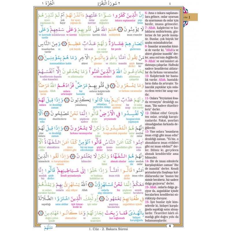 Kuranı Kerim Bilgisayar Hatlı Renkli Kelime Meali Rahle Boy 4 Renk, 1 Kalite Şamua Kağıt, Ofset Baskı , 624 Sayfa ... Kelime kelime farklı renklerde ifade edilmiş arapça metin ve türkçe meali... Kuranı Kerim Hattı Dünyada En Kolay Okunan Bilgisayar Hatlı... Seçilen yazı hem estetik hem de harflerin temel karakterlerini koruyan ve kolay okunmalarını sağlayan özel bir hattır. Kelime Kelime Renklendirilmiş olup, Aynı renkte altında meali yazmaktadır... Satır genişliği okuma kolaylığı sağlamak için arttırılmış, böylece harfler büyük satır ve harf aralıkları ferah tutulmuştur. Sayfa üstlerinde kullanılan kılavuzlarda surelerin ve cüzlerin isimleriyle beraber numaraları da verilerek okuyucunun aradığı sure ve cüz'ü numarasından da rahatlıkla bulabilmeleri amaçlanmıştır. Her bir sure başlığında, surenin adı, nazil olduğu yer ve ayet sayısı, rakam ve yazı ile belirtilerek sure hakkında bir ön bilgi verilmiştir.