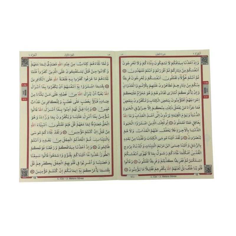 Kuranı Kerim Hatmi Şerif 30 Cüz Ayrı Ayrı Cami Boy DÜNYADA EN KOLAY OKUNAN HATTI İLE HAZIRLANDI.. *Seçilen yazı hem estetik hem de harflerin temel karakterlerini koruyan ve kolay okunmalarını sağlayan özel bir hattır. *Harekeler ait oldukları harflerin hemen altında ya da üstünde sıralanmış, özellikle okumaya yeni başlayanlar hareke karışıklıklarına meydan vermeyecek şekilde düzenlenmiştir. *Sayfa üstlerinde kullanılan kılavuzlarda surelerin ve cüzlerin isimleriyle beraber numaraları da verilerek okuyucunun aradığı sure ve cüz'ü numarasından da rahatlıkla bulabilmeleri amaçlanmıştır. *Her bir sure başlığında, surenin adı, nazil olduğu yer ve ayet sayısı, rakam ve yazı ile belirtilerek sure hakkında bir ön bilgi verilmiştir.