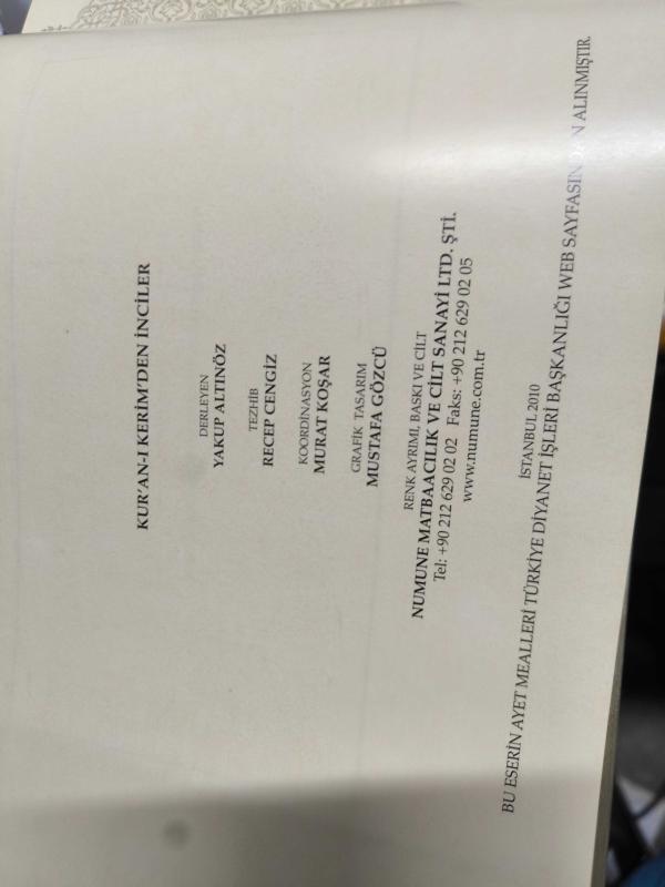 Kitap 2010 yılında Numune matbacilik tarafından [İstanbul] yayınlanmıştır. Kuranı kerimfen inciler adlı eser Türkçe dilindedir.