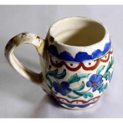 Kütahya porselen el boyaması antika kulplu kupa. Ağız çapı:6cm. Y.9 cm. başlıklı antika/koleksiyon objesinin menşei belirtilmemiştir. 1800-1849 arası dönemine aittir.