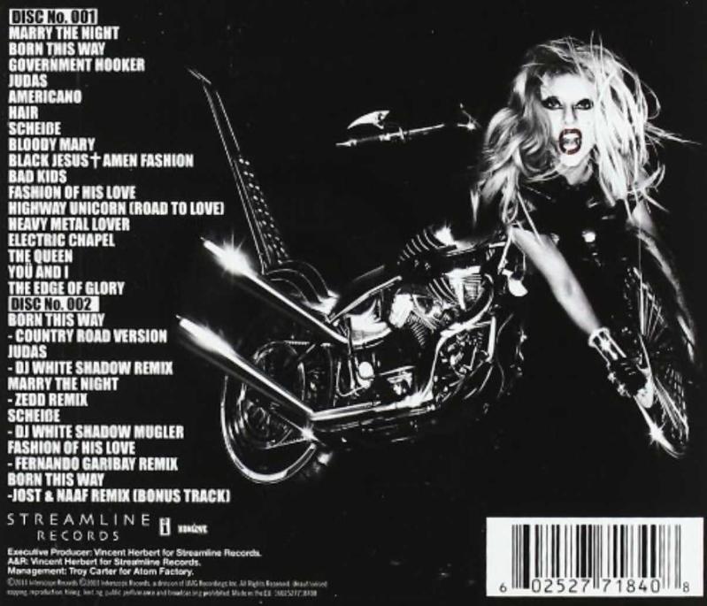 1-1 Marry The Night 4:24 1-2 Born This Way 4:20 1-3 Government Hooker 4:15 1-4 Judas 4:09 1-5 Americano 4:06 1-6 Hair 5:08 1-7 Scheiße 3:46 1-8 Bloody Mary 4:04 1-9 Black Jesus † Amen Fashion 3:37 1-10 Bad Kids 3:51 1-11 Fashion Of His Love 3:39 1-12 Highway Unicorn (Road To Love) 4:16 1-13 Heavy Metal Lover 4:12 1-14 Electric Chapel 4:12 1-15 The Queen 5:17 1-16 Yoü And I 5:07 1-17 The Edge Of Glory 5:21 2-1 Born This Way (Country Road Version) 4:21 2-2 Judas (DJ White Shadow Remix) 4:07 2-3 Marry The Night (Zedd Remix) 4:21 2-4 Scheiße (DJ White Shadow Mugler) 9:35 2-5 Fashion Of His Love (Fernando Garibay Remix) 3:46 Bonus Track 2-6 Born This Way (Jost & Naaf Remix) 5:59 2011 DELUXE DOUBLE CD KARGO SÜRESİ EN AZ İKİ HAFTADIR