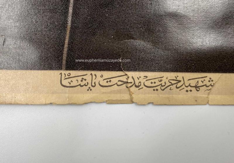 Şehid-i Hürriyet Mithat Paşa Büyük Boy Portre Osmanlıca açıklamalı. Edition (Editör): A. & H.K. Constantinople 42x33 cm, arka tarafı yıpranmış haliyle. 1908, II. Meşrutiyet sonrası basılan nadir afiş. Midhat Paşa (1822-1884) Osmanlı devlet adamıdır. İki kez sadrazam, Tuna, Aydın ve Suriye Valisi olan Midhat Paşa, ilk Osmanlı anayasası olan Kânûn-ı Esâsî'yi hazırlayan kurulun başkanlığını yaptı. II. Abdülhamid tarafından Arabistan'da Taif Kalesi'ne sürülen paşa, 3 yıl burada sıkı denetim altında yaşadıktan sonra 8 Mayıs 1884 gecesi muhafızları tarafından boğularak öldürüldü. Bu cinayetin padişahın emri ile gerçekleştiği ileri sürüldü ise de bu konuda 1909 ihtilalinden sonra araştırılan Yıldız Sarayı evrakı arasında dahî kanıt bulunamamıştır. (Vikipedi).
