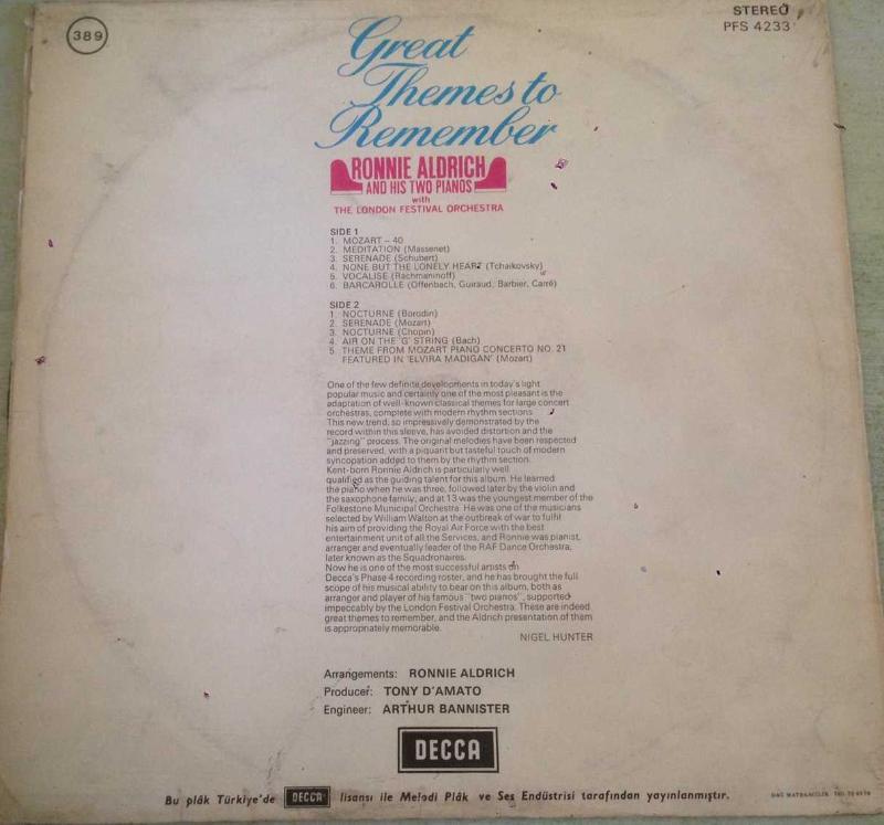 LONG PLAY - GREAT THEMES TO REMEMBER- RONNIE ALDRICH AND HIS TWO PIANOS WİTH THE LONDON FESTIVAL ORCHESTRA, en son 1 yıl önce güncellenmiştir.