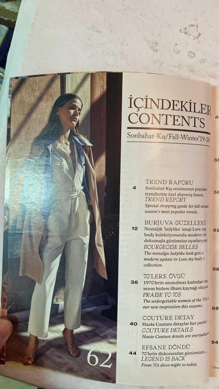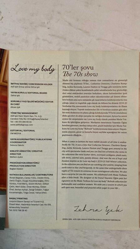 LOVE MY BODY DERGİSİ - SONBAHAR-KIŞ 2019-2020 SAYI: 15 ZEHRA IŞIK - ALICAN IŞIK - DEBORA ZAKUTO - MELTEM AYDIN - BAĞLAN KESKİN - BURAK BAŞARAN - CANSU YILDIZ - CEYLAN ATİNÇ - DENİZ ÖZGÜN - DUYGU KÜÇÜKKARAAĞAÇ - EBRU GÜRBÜZ - FIRAT MERİÇ - GİZEM MUHAN - GÖKÇE ÇETİN - MERT GÜLER - ÖMER MUMAY - ÖZKAN ÖNAL - SERHAN AYHAN - SEVGİ ÖZBAKIR - TUĞÇE KOCAMANOĞLU - TOLGA ÜNSAL - YAHYA DİLSİZ - CATHERINE DENEUVE - CHARLOTTE RAMPLING - JACKIE KENNEDY - LAUREN HUTTON - TWIGGY - YASEMİN ÖĞÜN SEZONUN 4 İKON PARÇASI - YILDIZLARDAN İLHAM ALIN - SONBAHAR KIŞ TREND REHBERİ - 70’LER ŞOVUNA HAZIR MISIN - BURJUVA GÜZELLERİ - TREND RAPORU - BURJUVA GÜZELLERİ MODERN DOKUNUŞ - 70’LERE ÖVGÜ - COUTURE DETAY - EFSANE DÖNDÜ - 70’LERİN DİSKOSUNDAN GÜNÜMÜZE - MODA TUTKUSU İŞBİRLİĞİ REFRESH KOLEKSİYONU - LOVE MY BODY KOLEKSİYONU - 70’LERİN UNUTULMAZ KADINLARI - TOPRAK TONLARINDAN LİLA VE BORDOYA RENK SKALASI - DISKO GECELERİ VE ABİYE PARÇALAR - YASEMİN ÖĞÜN TASARIMLARI - MODERN LADYLIKE - TAM TAKIM EKSİKSİZ 96 SAYFA, ZEHRA IŞIK tarafından kaleme alınmıştır. Eser ALİCAN IŞIK editörlüğünde hazırlanmıştır. Kitap . tarafından yayınlanmıştır. 96 sayfadır. LOVE MY BODY DERGİSİ - SONBAHAR-KIŞ 2019-2020 SAYI: 15 ZEHRA IŞIK - ALICAN IŞIK - DEBORA ZAKUTO - MELTEM AYDIN - BAĞLAN KESKİN - BURAK BAŞARAN - CANSU YILDIZ - CEYLAN ATİNÇ - DENİZ ÖZGÜN - DUYGU KÜÇÜKKARAAĞAÇ - EBRU GÜRBÜZ - FIRAT MERİÇ - GİZEM MUHAN - GÖKÇE ÇETİN - MERT GÜLER - ÖMER MUMAY - ÖZKAN ÖNAL - SERHAN AYHAN - SEVGİ ÖZBAKIR - TUĞÇE KOCAMANOĞLU - TOLGA ÜNSAL - YAHYA DİLSİZ - CATHERINE DENEUVE - CHARLOTTE RAMPLING - JACKIE KENNEDY - LAUREN HUTTON - TWIGGY - YASEMİN ÖĞÜN SEZONUN 4 İKON PARÇASI - YILDIZLARDAN İLHAM ALIN - SONBAHAR KIŞ TREND REHBERİ - 70’LER ŞOVUNA HAZIR MISIN - BURJUVA GÜZELLERİ - TREND RAPORU - BURJUVA GÜZELLERİ MODERN DOKUNUŞ - 70’LERE ÖVGÜ - COUTURE DETAY - EFSANE DÖNDÜ - 70’LERİN DİSKOSUNDAN GÜNÜMÜZE - MODA TUTKUSU İŞBİRLİĞİ REFRESH KOLEKSİYONU - LOVE MY BODY KOLEKSİYONU - 70’LERİN UNUTULMAZ KADINLARI - TOPRAK TONLARINDAN LİLA VE BORDOYA RENK SKALASI - DISKO GECELERİ VE ABİYE PARÇALAR - YASEMİN ÖĞÜN TASARIMLARI - MODERN LADYLIKE - TAM TAKIM EKSİKSİZ 96 SAYFA adlı eser Türkçe dilindedir.