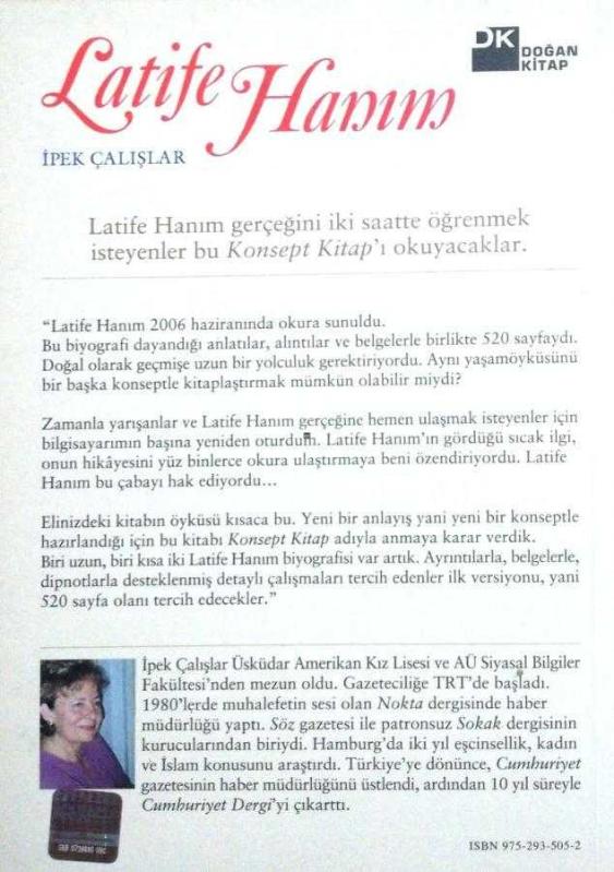 Latife Hanım, İpek Çalışlar tarafından kaleme alınmıştır. Kitap 2006 yılında Doğan Kitap tarafından yayınlanmıştır. 127 sayfadır. Latife Hanım adlı eser Türkçe dilindedir.