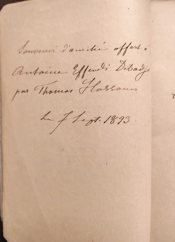 "Souvenir l'amitie offert a Antoine Efendi Dibalji par Thomas Hassoun. 27 Sept 1893" ithafıyla imzalı. Thomas Hassoun: Sous directeur du bureau de traduction de l'administration des contributions indirects. ***************** Özgün kapağında. Arka kapak ve kapağın sırt kısmı mevcut değildir. Ön kapak yorgun durumda. Metin kısmı temiz durumda. 153 sayfa. Eksiksiz. Yazarndan ithaflı imzalı.