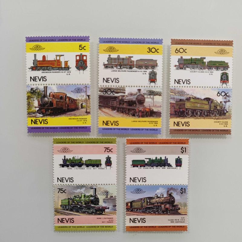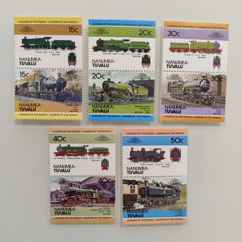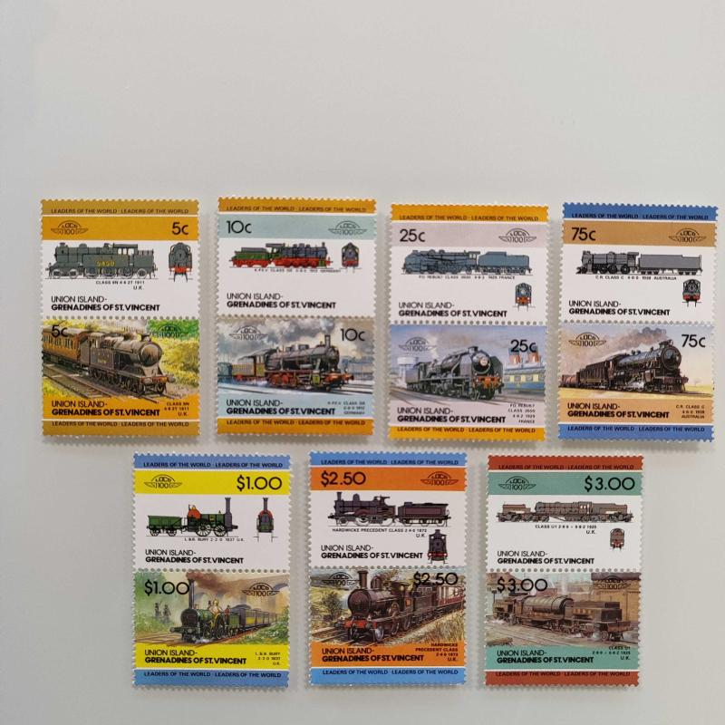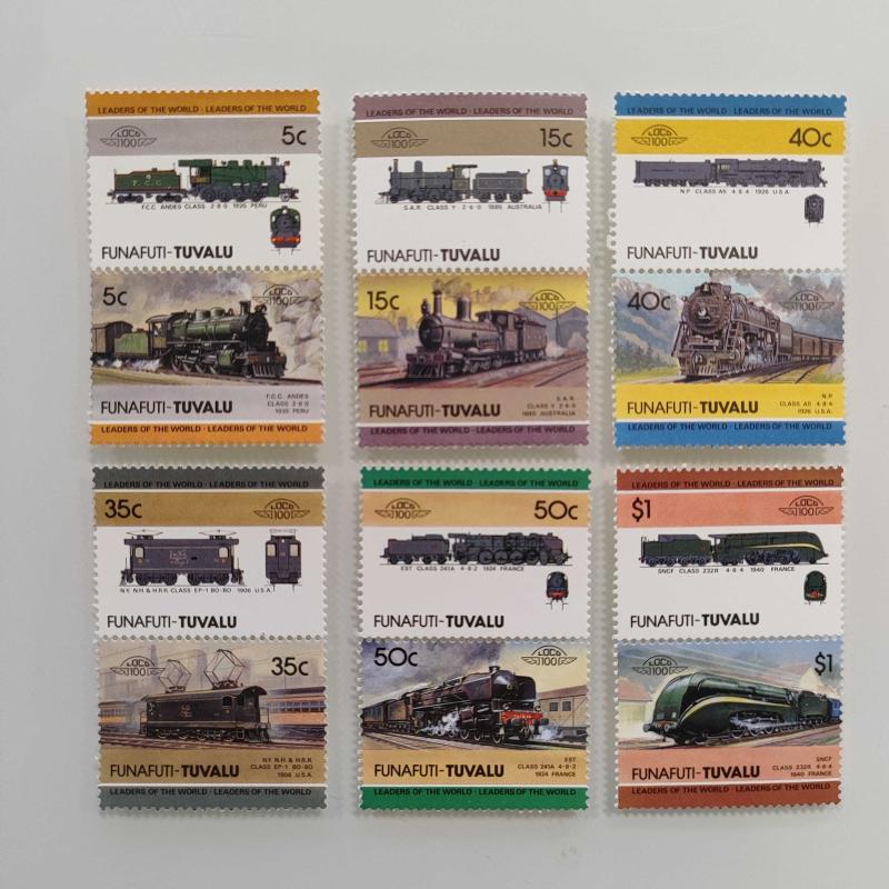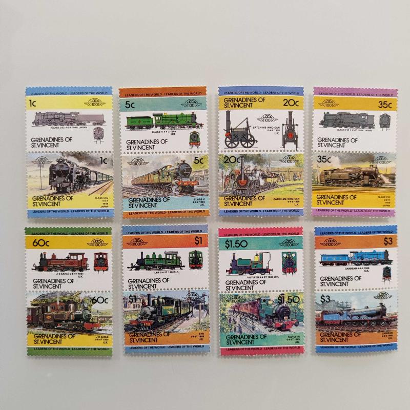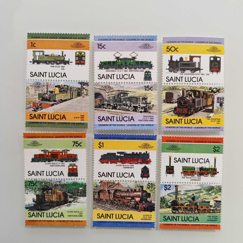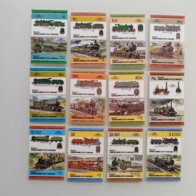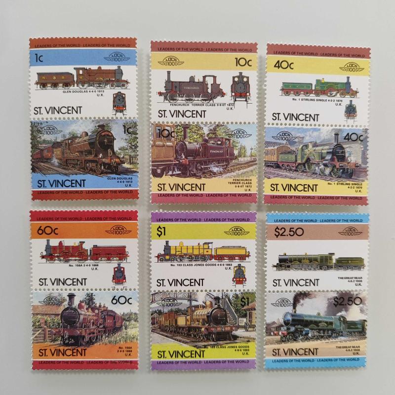 Leaders of the World Lokomotif Temalı Pul Setleri Bequia: 12 çift. Grenadines of St. Vincent: 8 çift. Union Island: 7 çift. Saint Lucia: 6 çift. St. Vincent: 6 çift. Funafuti-Tuvalu: 6 çift. Nevis: 5 çift. Nanumea-Tuvalu: 5 çift. Toplam fiyat 55 çift pul