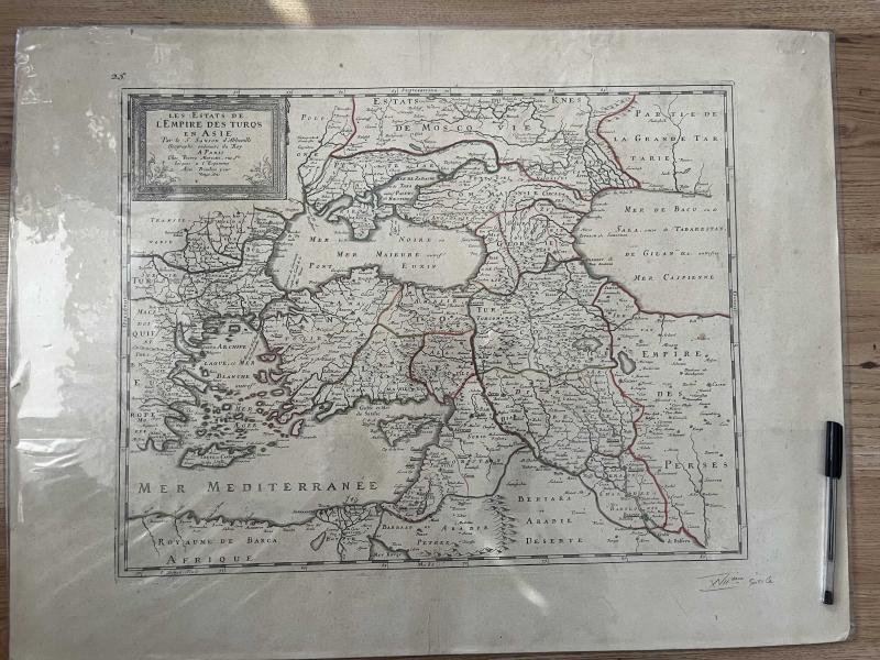 Büyük boy: 70x52 cm. Les Estats de l’Empire des Turcs en Asie” (“Asya’da Türk/Osmanlı İmparatorluğu’nun Eyaletleri”) Altında imza: “Par le Sr. Sanson d’Abbeville, Géographe Ordinaire du Roy, A Paris…” Bu ifade, haritanın Louis XIII – Louis XIV döneminin resmî saray coğrafyacısı Nicolas Sanson (1600–1667) tarafından hazırlanmış olduğunu gösterir. Sanson, “Fransız Kartografyasının Babası” olarak kabul edilir. Bu yüzden haritaları çok değerlidir. Sanson’un Osmanlı haritaları: • İlk baskılar: 1650–1657 • Yeniden basımlar: 1660–1690 (oğlu Guillaume Sanson & Pierre Mariette tarafından) Bu harita: • Yazı karakteri • Çerçeve stili • Meridyen işaretleme biçimi • Renkli sınırların elle yapılması • Kağıt boyutu ve dokusu gibi işaretler nedeniyle 1645–1680 arası bir baskıdır. Harita: • Anadolu • Suriye • Irak • İran’ın bir bölümü • Kafkasya • Karadeniz • Ege Adaları • Doğu Akdeniz’in tamamı • Kıbrıs • Gürcistan • Ermenistan • Batı İran gibi geniş Osmanlı Asyası coğrafyasını içeriyor. Bu harita Sanson’un Doğu’nun en önemli siyasal haritalarından biridir ve özellikle bu haritası, genel Osmanlı haritasına kıyasla nadir bulunur. Harita %100 orijinaldir ve çok iyi korunmuştur. Eyalet sınırları dönem renklendirmesidir. Yurtdışı güncel piyasa değerine internet araştırmasıyla ulaşabilirsiniz.