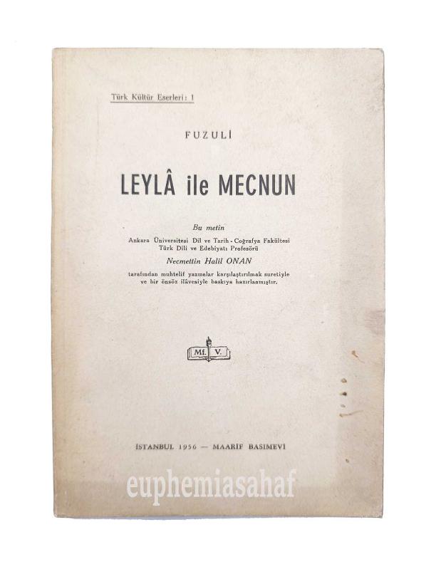 Özgün karton kapağında, çok temiz durumda, 23,5 x 16 cm, [2], 304, [2] sayfa. Leylâ ile Mecnun. FUZULİ. Maarif Vekaleti, İstanbul, 1956. Ankara Üniversitesi Dil ve Tarih-Coğrafya Fakültesi Türk Dili ve Edebiyatı Profesörü Necmettin Halil Onan tarafından muhtelif yazmalar karşılaştırılmak suretiyle ve bir önsöz ilavesiyle baskıya hazırlanmıştır. Basım tarihi dış kapakta 1956, iç kapakta 1955'tir. -- Klasik edebiyat. Divan edebiyatı.