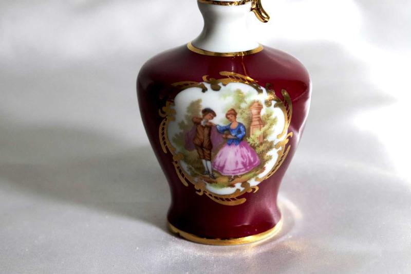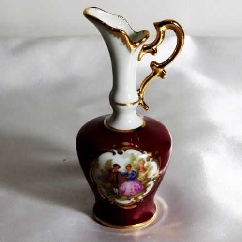 Limoges imzalı, yüzeyine el boyaması yaşam tarzı teması işlenmiş, minyatür kulplu porselen vazo. Kondisyonu süper. Hiçbir kırık veya çatlak yoktur. Y:12,5cm.