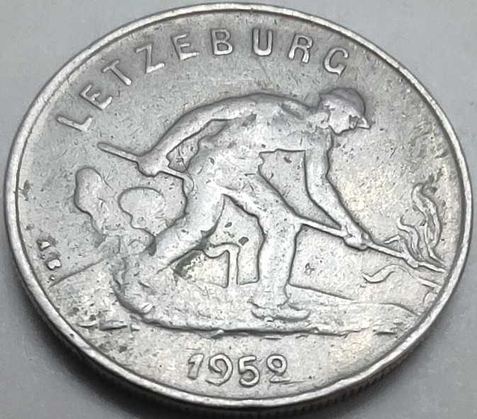 Lüksemburg nümismatiğinin en zarif serilerinden biri olan bu 1952 tarihli 1 Frank, ülkenin modernleşme sürecindeki en önemli figürü olan Büyük Düşes Charlotte dönemine aittir. Paranın ön yüzünde (obverse), Charlotte'un sağ profilden şık bir büstü; arka yüzünde (reverse) ise ülkenin çelik sanayisini ve işçi gücünü simgeleyen, elinde balyoz tutan efsanevi "Demirci" (Feuerwerker) figürü yer alır. Bakır-nikel alaşımından üretilen bu para, Lüksemburg Frankı'nın Belçika Frankı ile olan birliği (UEBL) döneminin karakteristik bir örneğidir. Özellikle "Demirci" figürü, dönemin Avrupalı madeni paraları arasındaki en estetik ve maskülen tasarımlardan biri olarak kabul edilir.